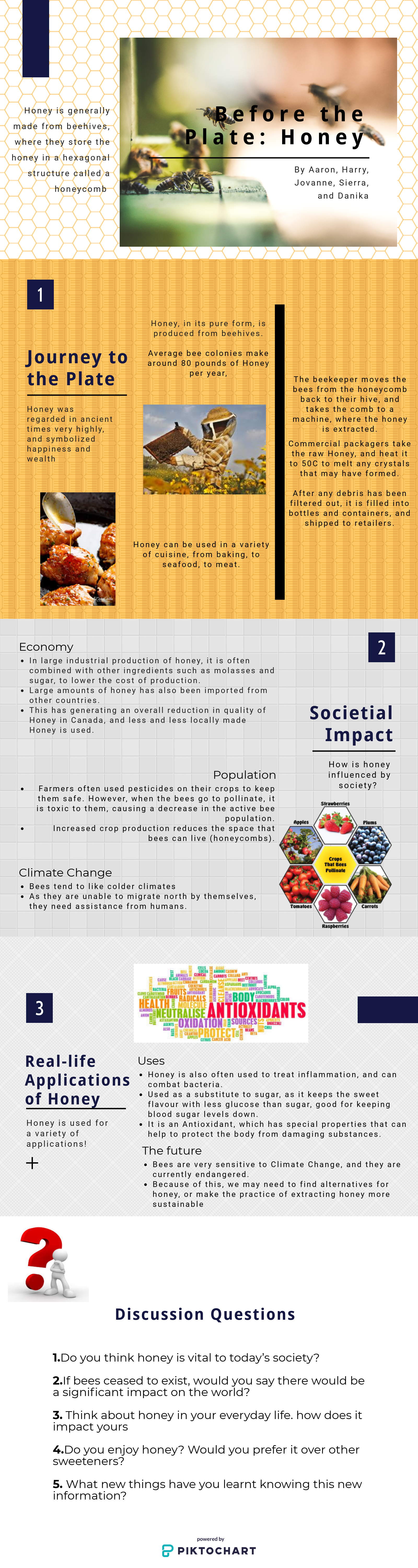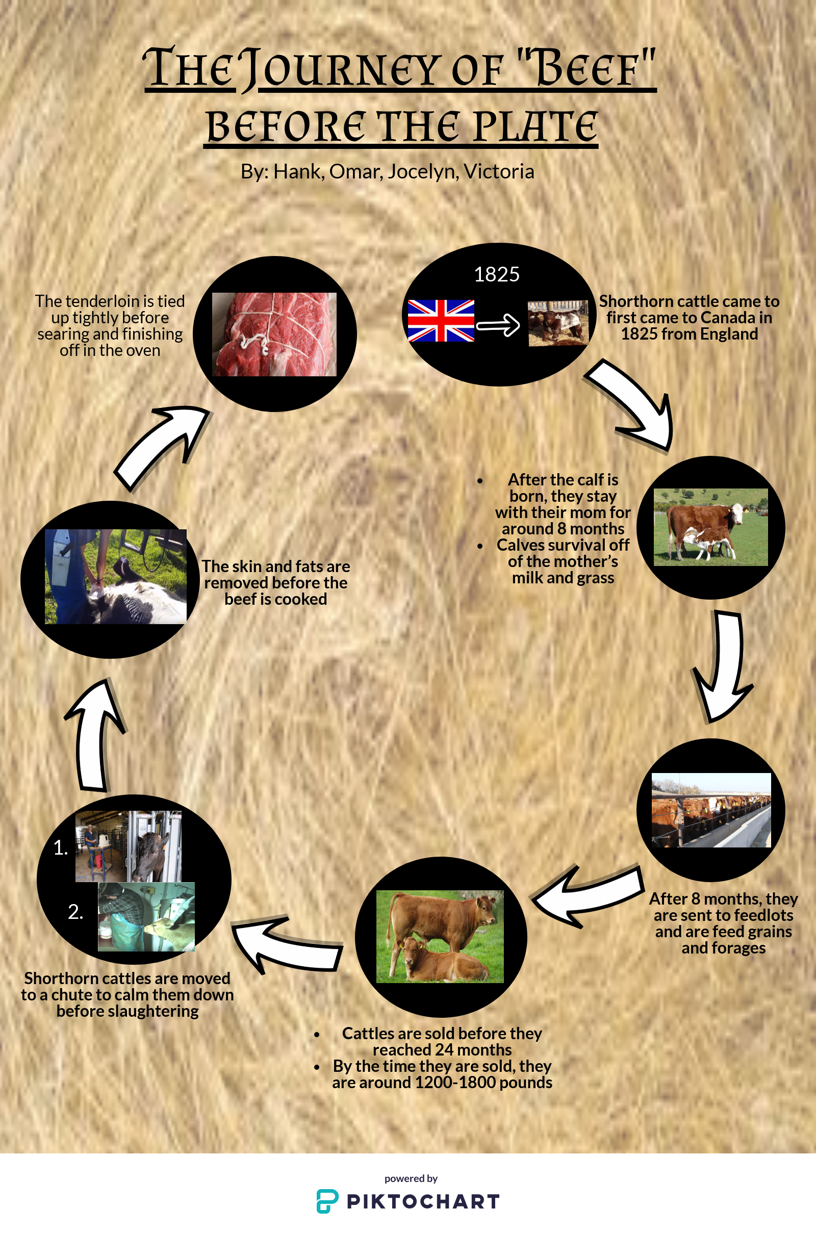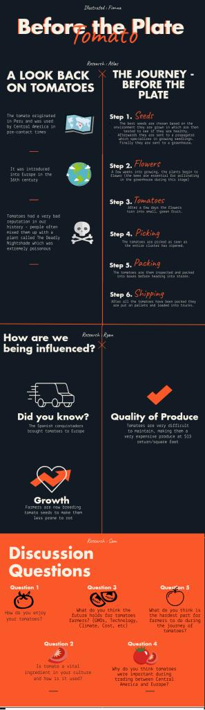 In groups, we created infographics to showcase a few of the ingredients covered in the documentary. The infographics below explore the farm to table journey for a variety of ingredients – covering different factors like geography, history, technology, climate, the economy that are at play. These infographics hope to inspire curiousity and future questions about where your food comes from, how it is grown and who grows it – before it arrives on your plate.
