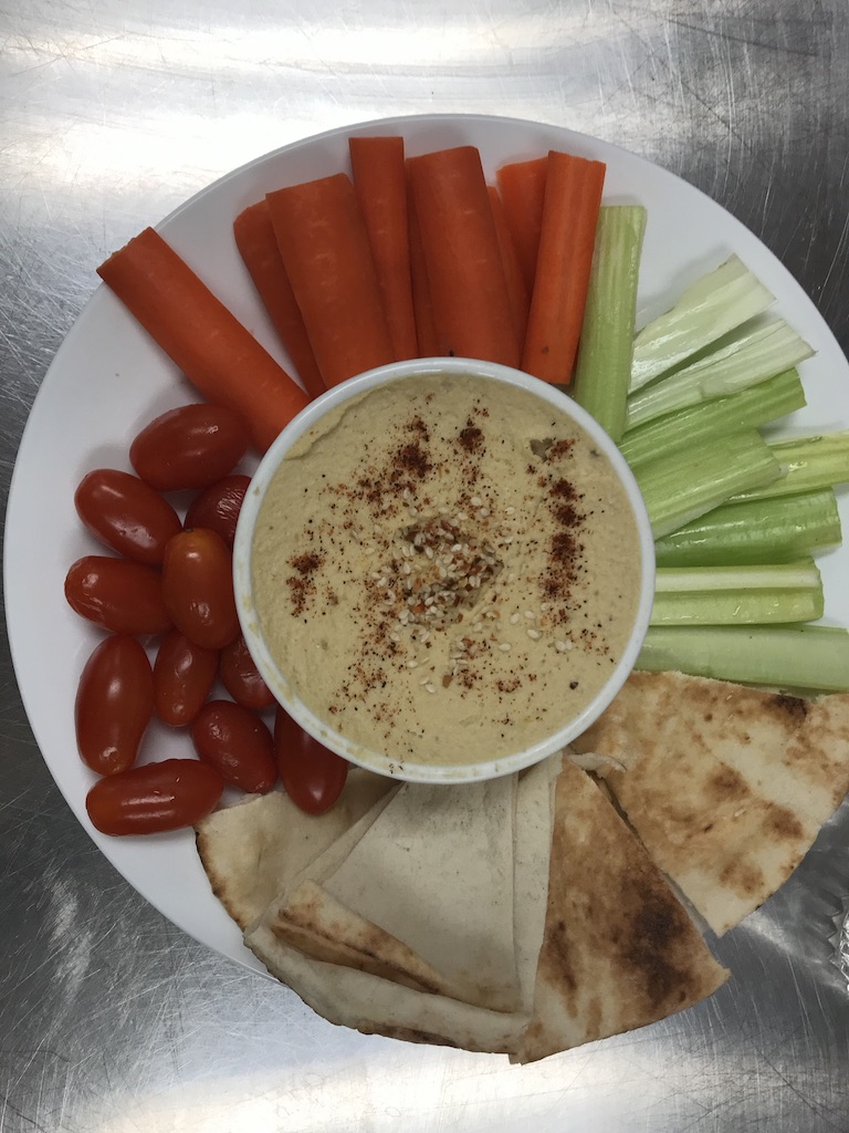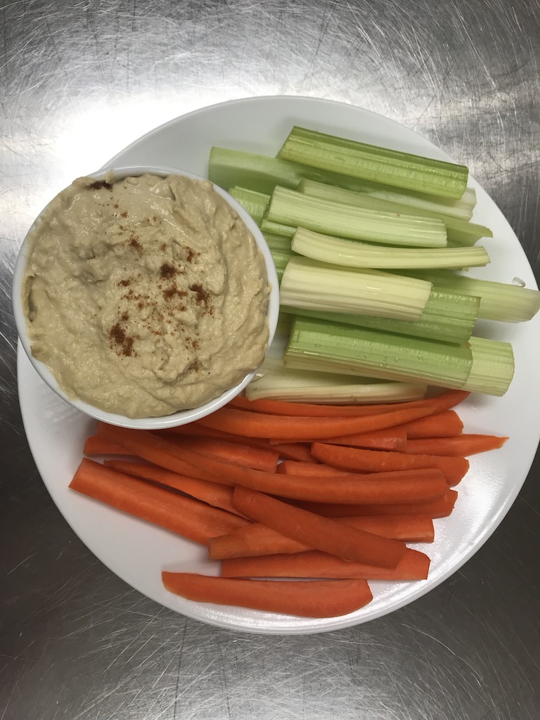 - While chickpeas are cooking, begin cutting vegetables and preparing platter.